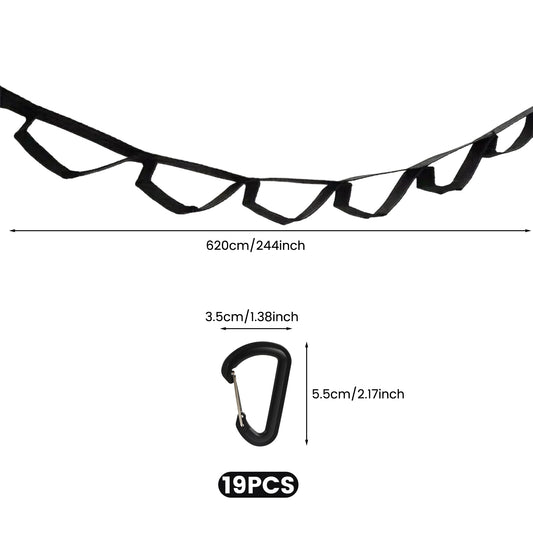 Campsite Storage Strap with 19 Separated Loops for Hanging Camping Equipment, Gear and Supplies | Includes Carabiner Hooks and Clothes Pins | Durable Campground Organizer Holds up to 150 LBS