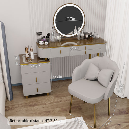 Modern Style Vanity Table with Movable Side Cabinet and 4-Drawers,Large Size Dressing Table with Mirror and 3-colors LED Light,Makeup Table with Stool,White,Golden Legs