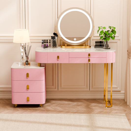 Modern Style Vanity Table with Movable Side Cabinet and 4-Drawers,Large Size Dressing Table with Mirror and 3-colors LED Light,Makeup Table with Stool,White,Golden Legs