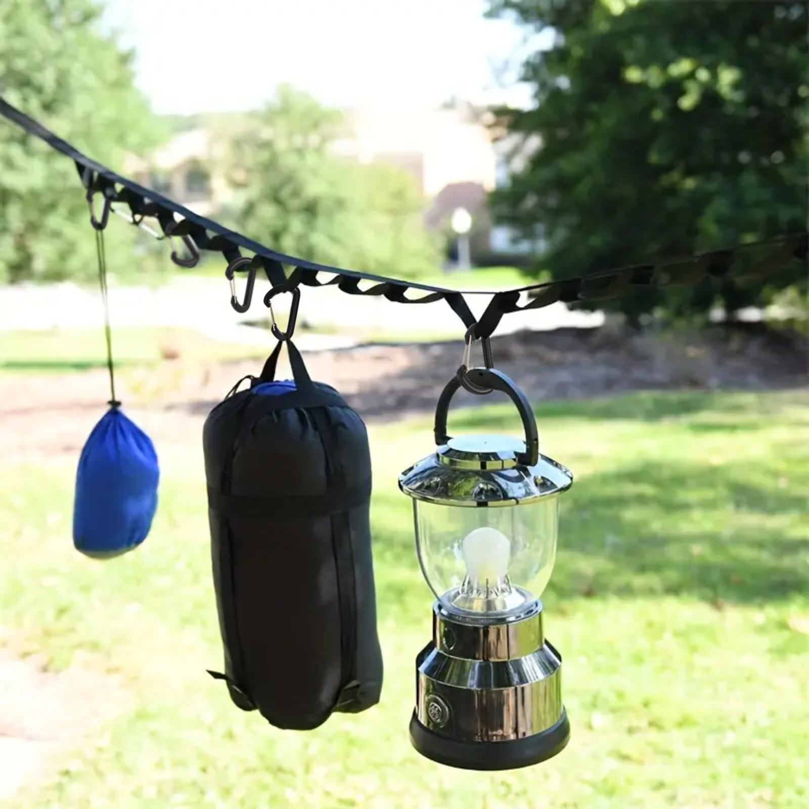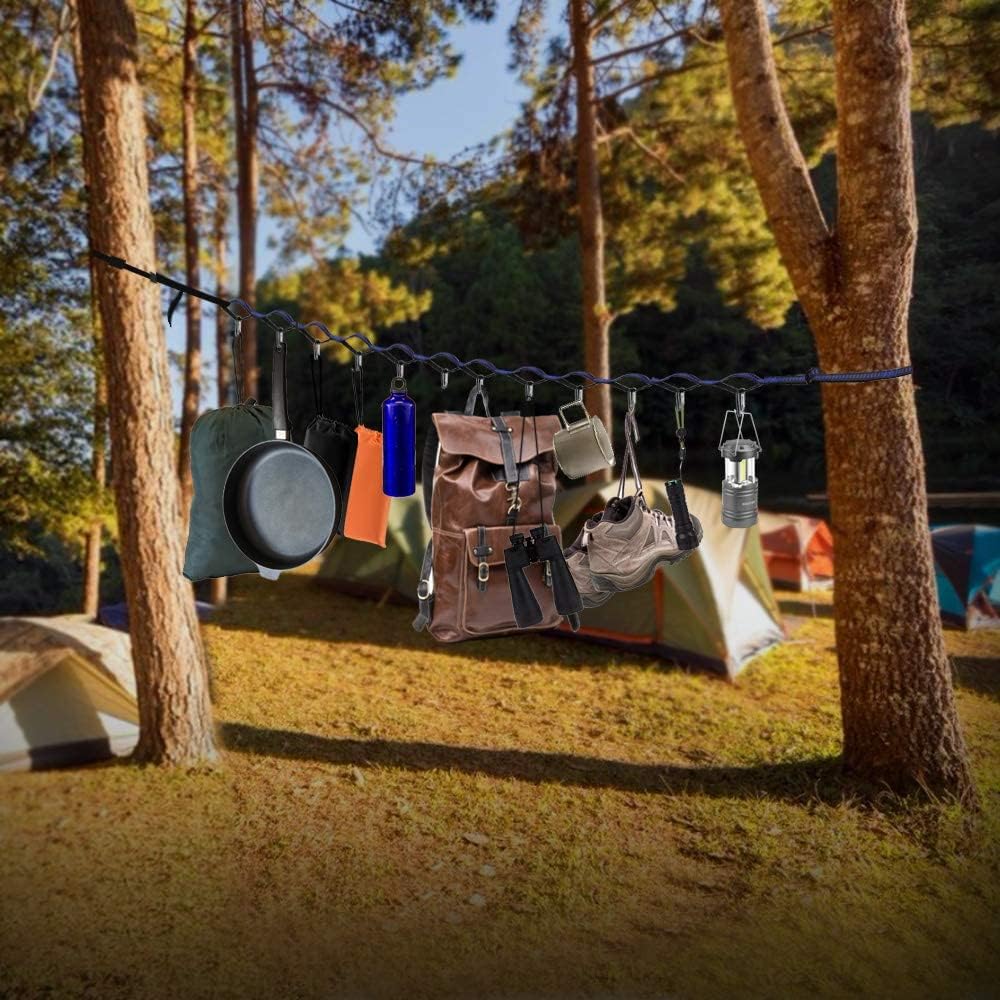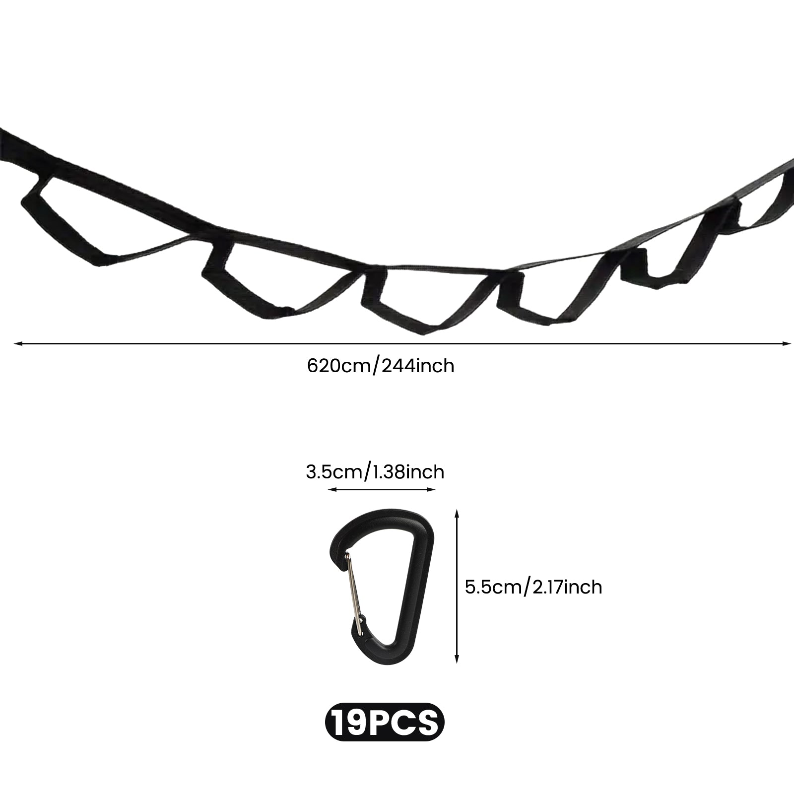 Campsite Storage Strap with 19 Separated Loops for Hanging Camping Equipment, Gear and Supplies | Includes Carabiner Hooks and Clothes Pins | Durable Campground Organizer Holds up to 150 LBS