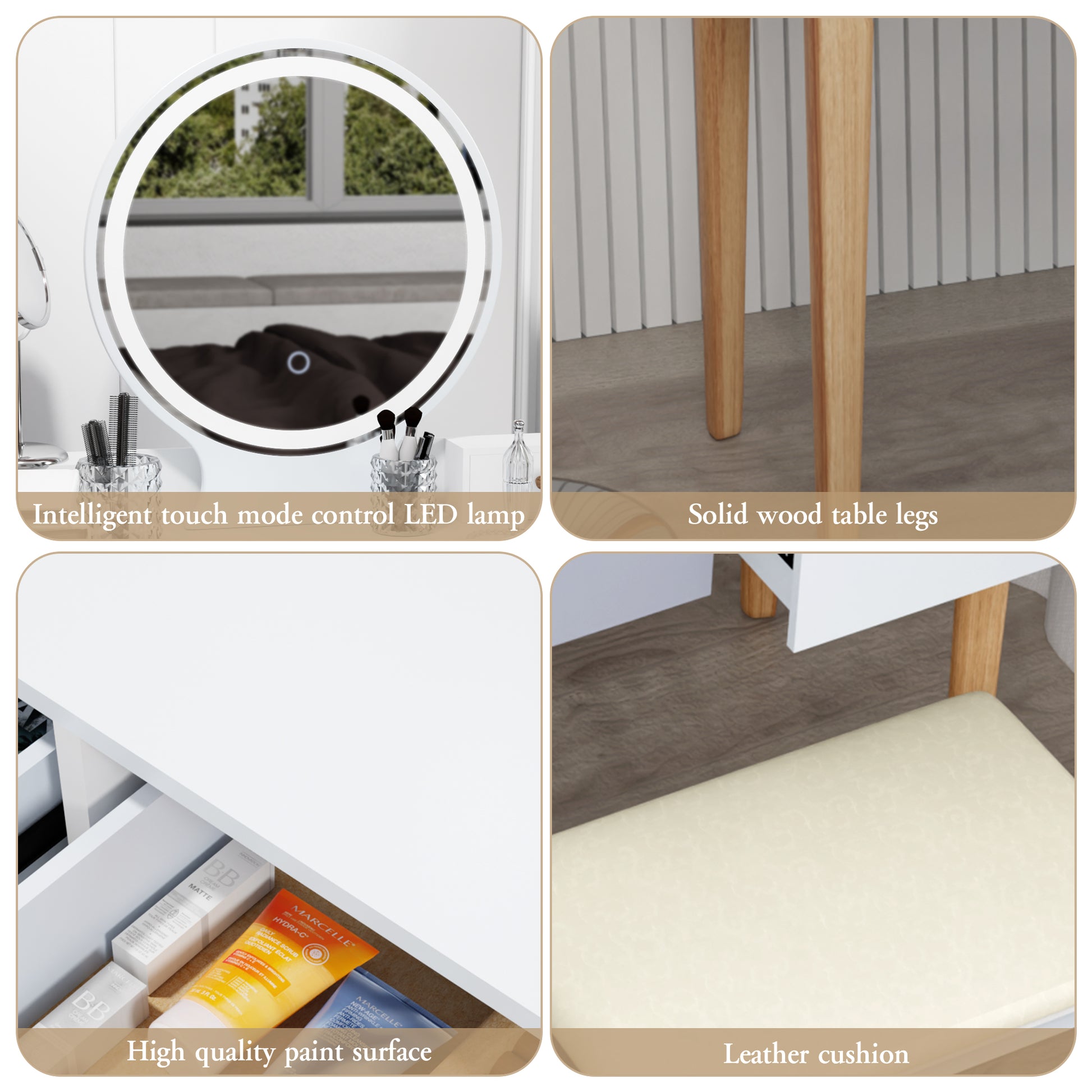 The round mirror is surrounded by an LED light that has three different color temperatures.