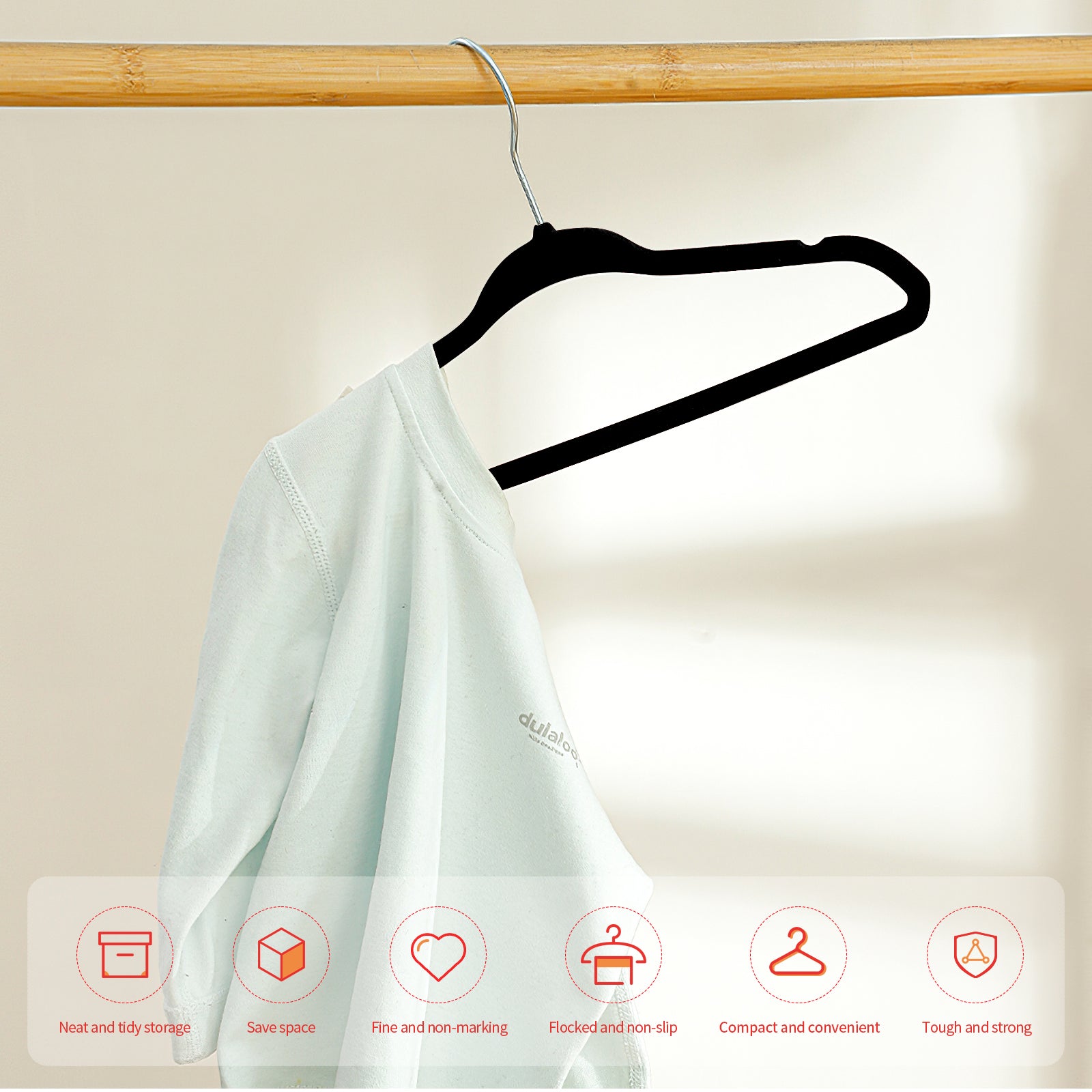 Maximize your closet space with this 30-pack of Premium Black Velvet Hangers. Designed with a non-slip felt surface and a 360° swivel hook, these hangers keep clothes securely in place while allowing easy access. Their sturdy construction supports up to 10 lbs, making them perfect for coats, shirts, and pants. Upgrade your wardrobe organization with durable, space-saving hangers that combine functionality and style.