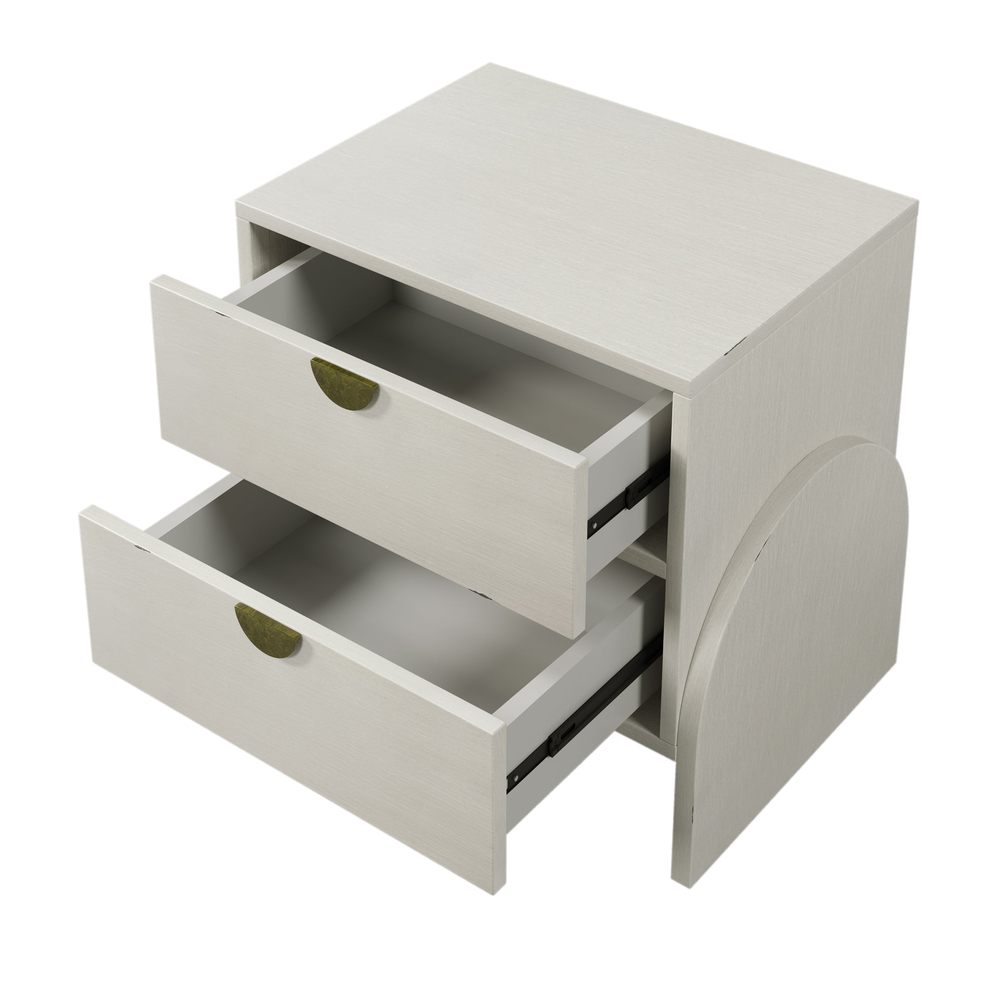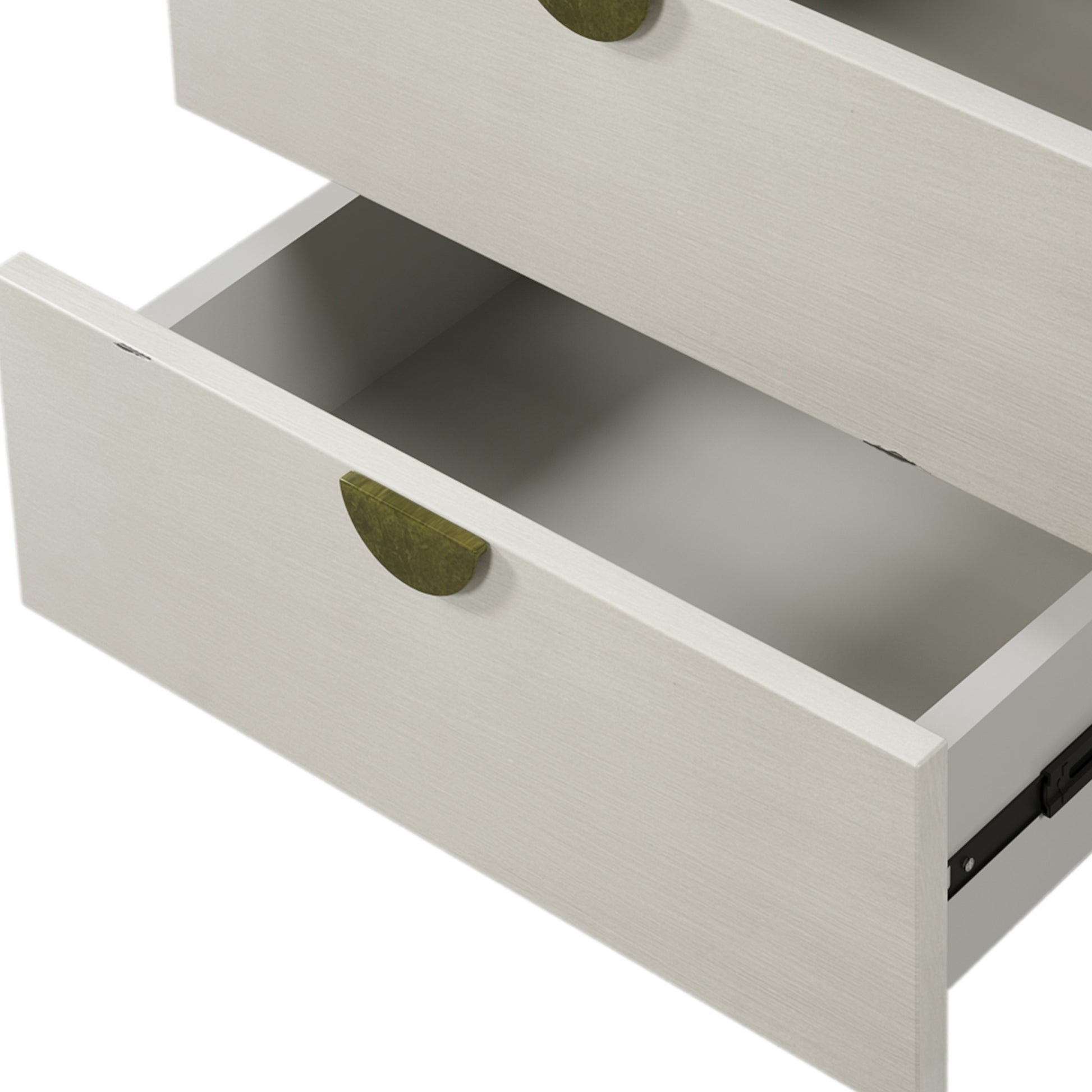 It features two exquisite drawers, each decorated with a textured bronze semi-circular handle for easy putting and taking out items.